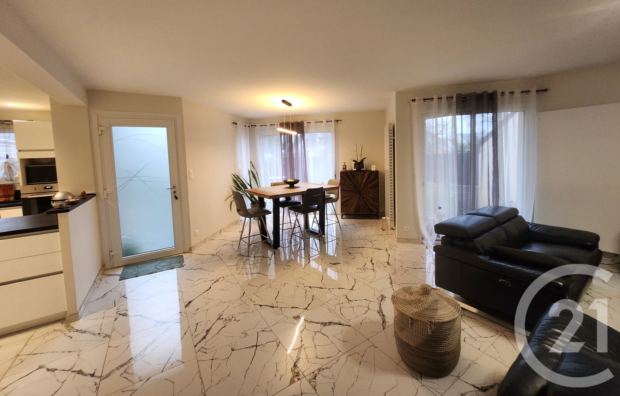 Une belle pièce de vie lumineuse avec cuisine ouverte, aménagée et entièrement équipée
